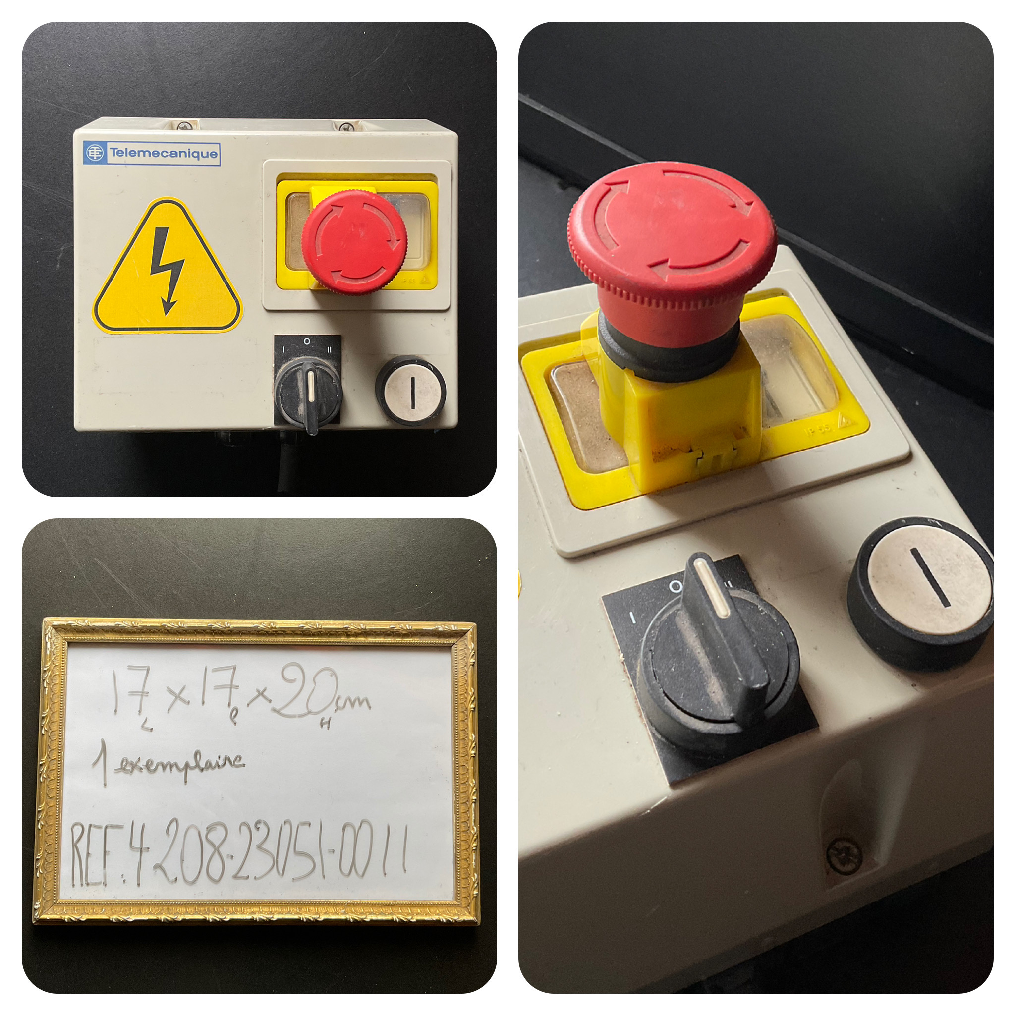 Bloc arrêt d'urgence blanc avec le symbole "attention électrique " et un bouton rouge