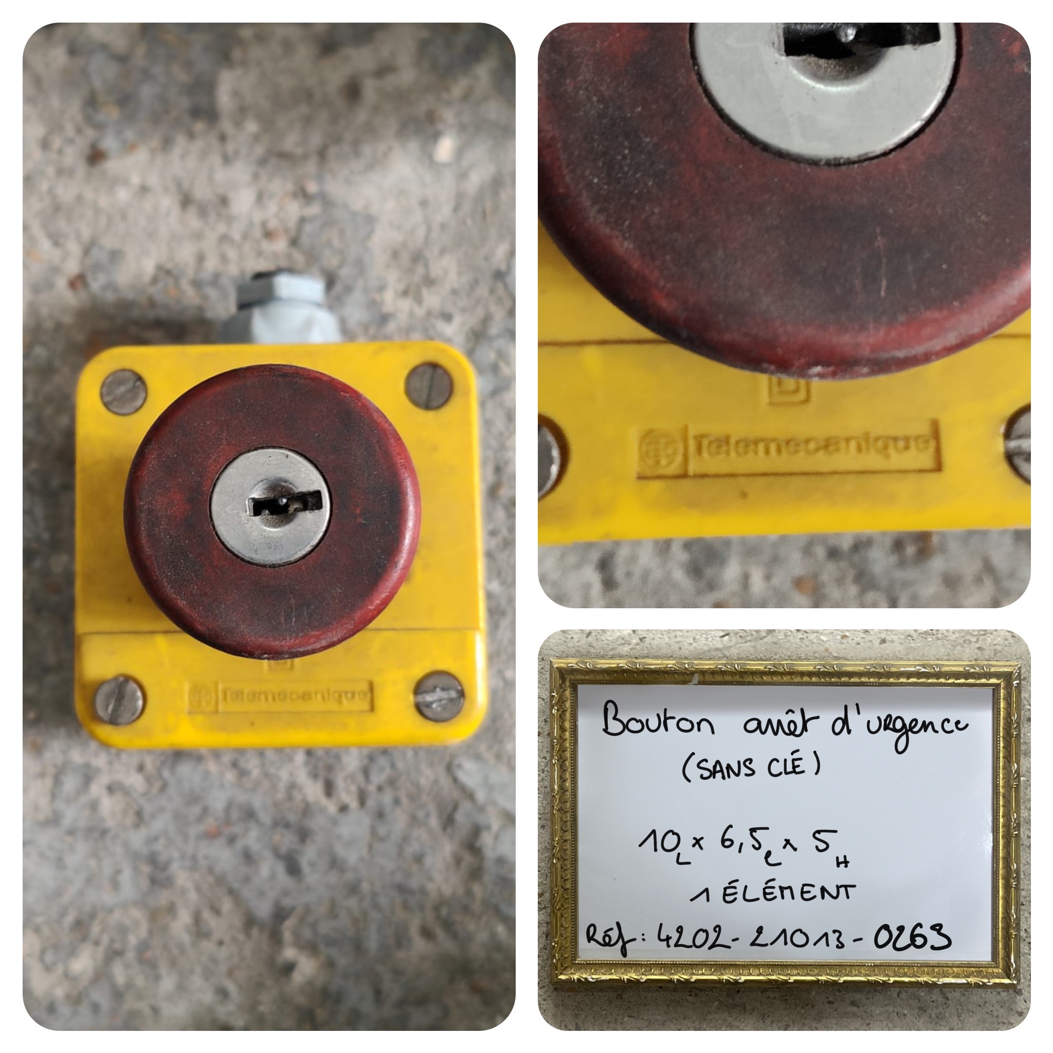 Bouton d'arrêt d'urgence jaune et rouge à clef. Marque "TELEMECANIQUE".