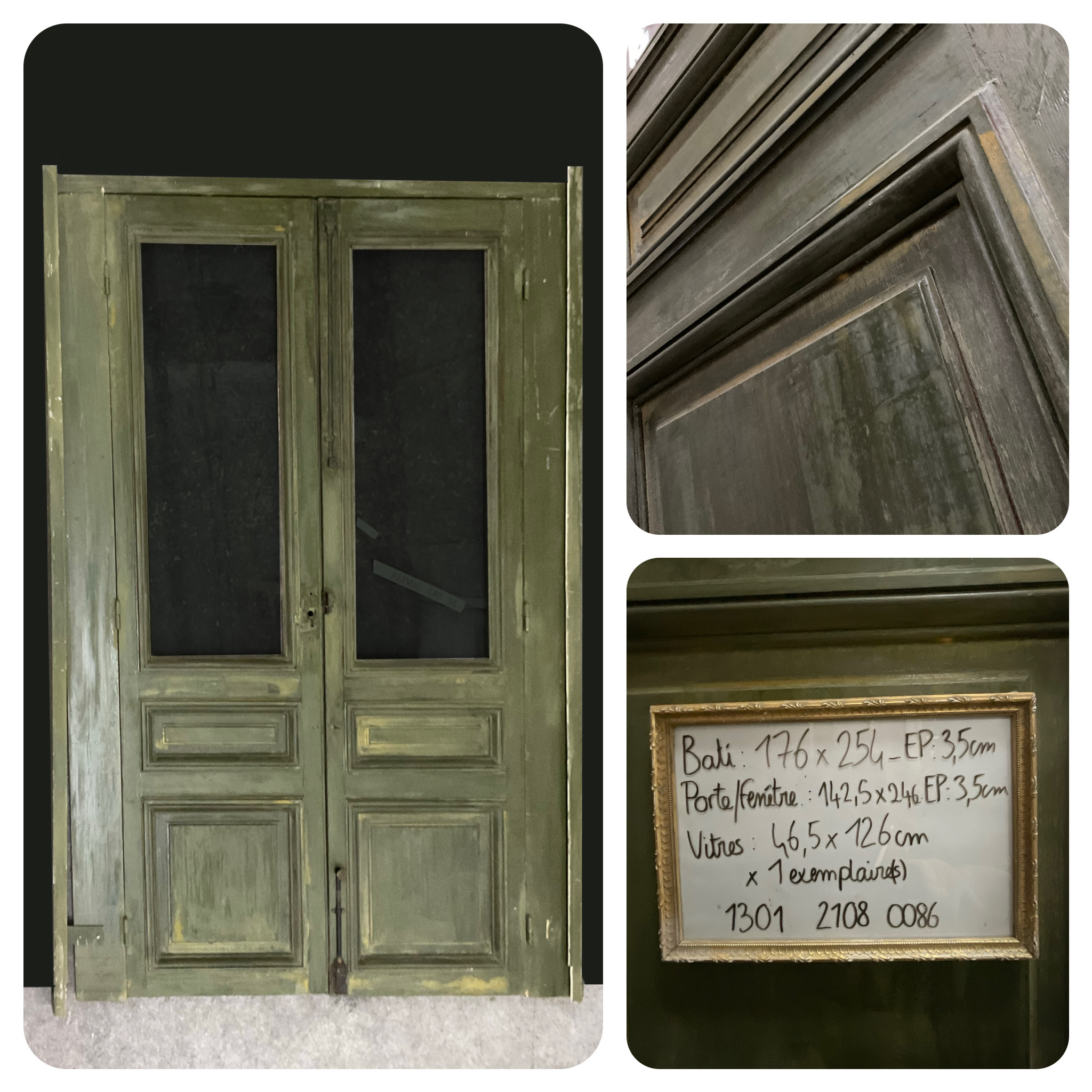 Bâti : 254 x 176 x 3,5 cm - Porte : 246 x 142,5 - Vitre : 126 x 46,5 cm.