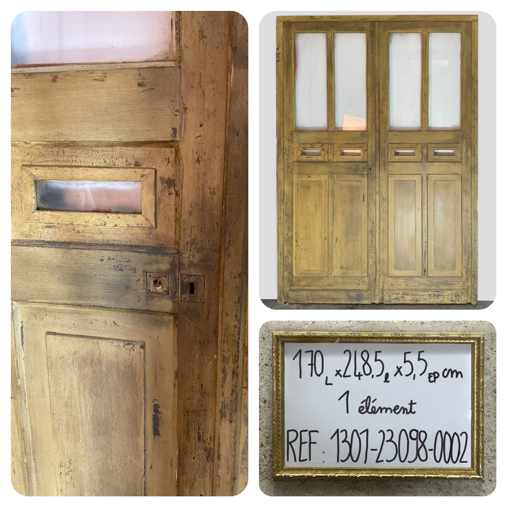 Bâti : 248,5 x 170 x 5,5 cm - La porte : 243 x 80 cm - Les deux portes : 243 x 160 cm. Grandes vitres : 84 x 28 cm.