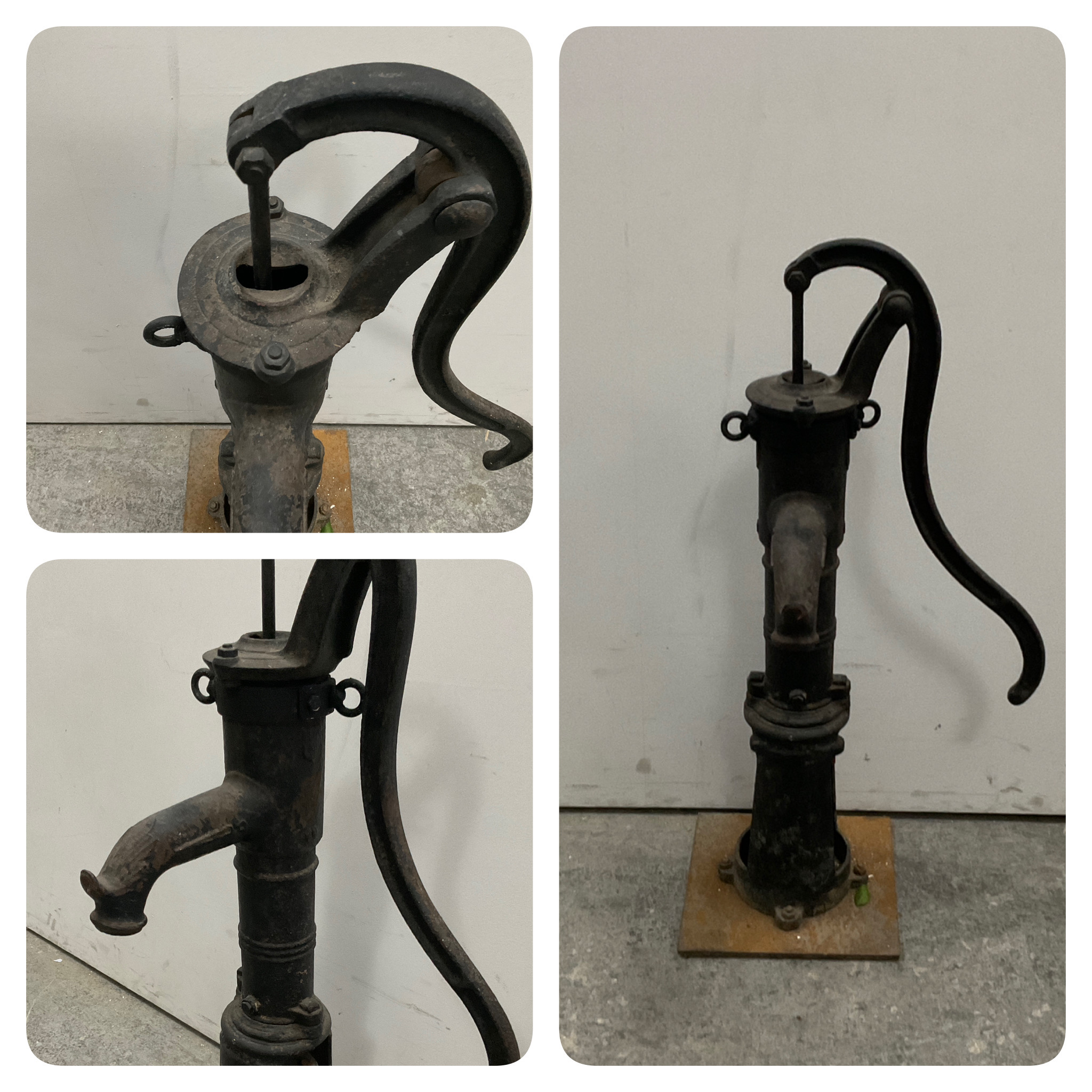 Fontaine noire avec pompe rouillée sur socle