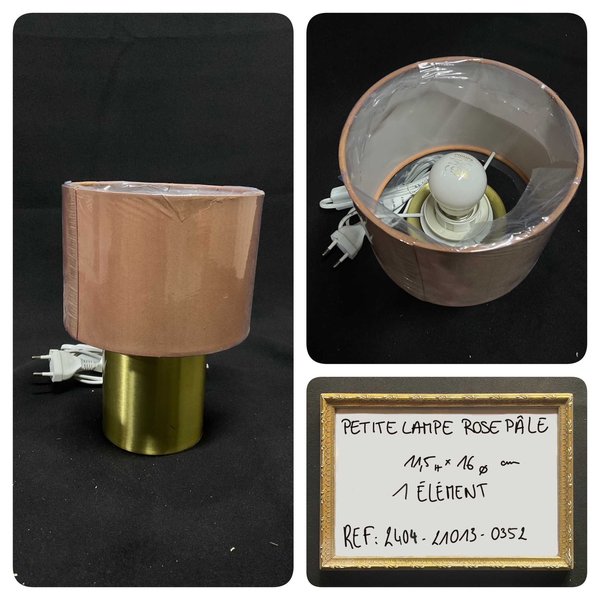 Lampe de chevet moderne, style 70, pied cylindrique doré, abat-jour rose pâle, neuve, H 11,5 x D 16 cm