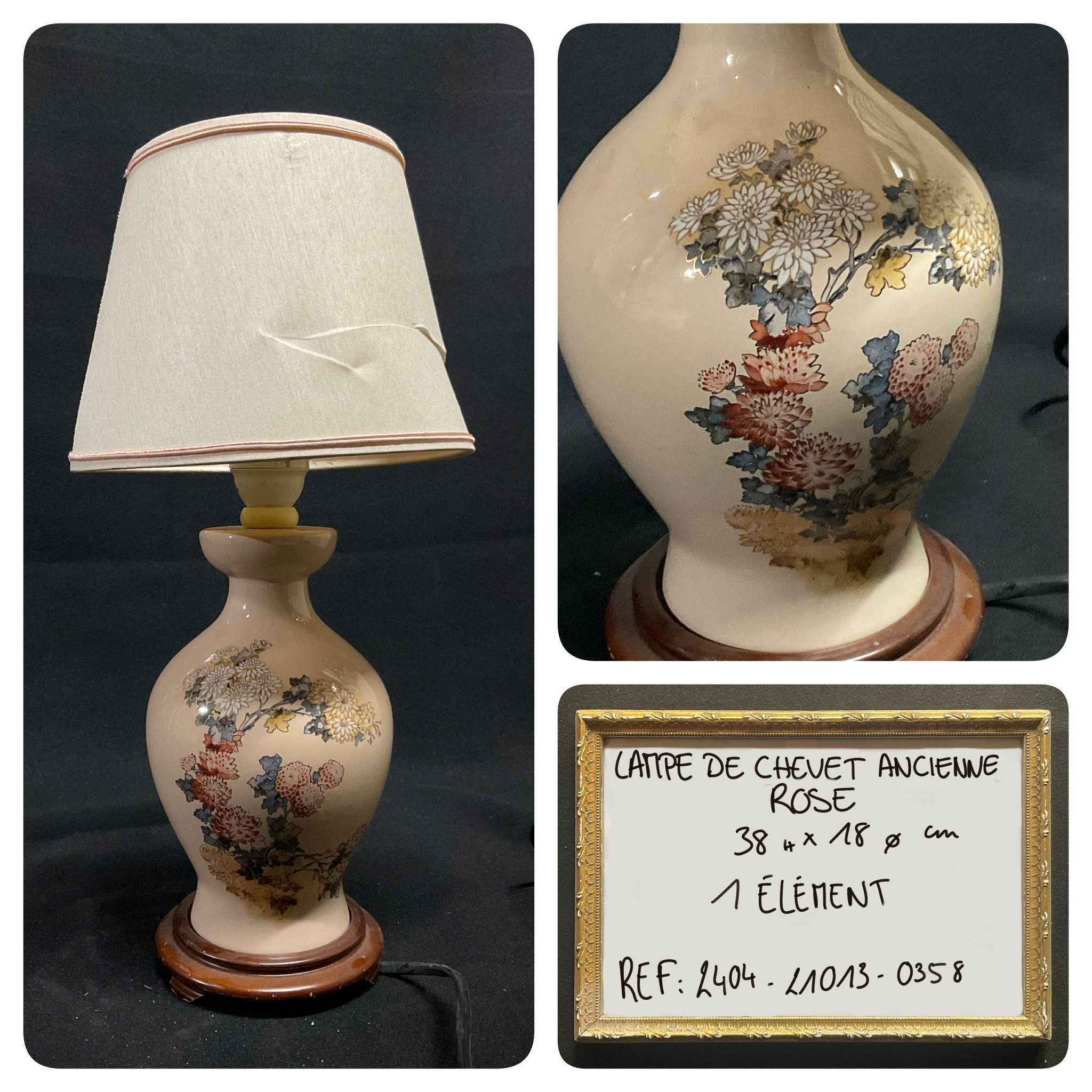 Lampe de chevet pied rose en céramique imprimé asiatique, abat-jour crème, H 38 x D 18 cm + abat-jour en sus