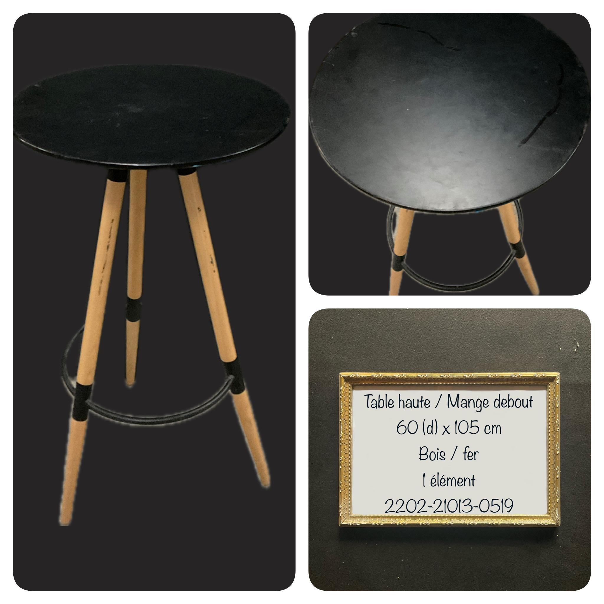 Table haute mange debout. Trois pieds en bois et plateau noir.