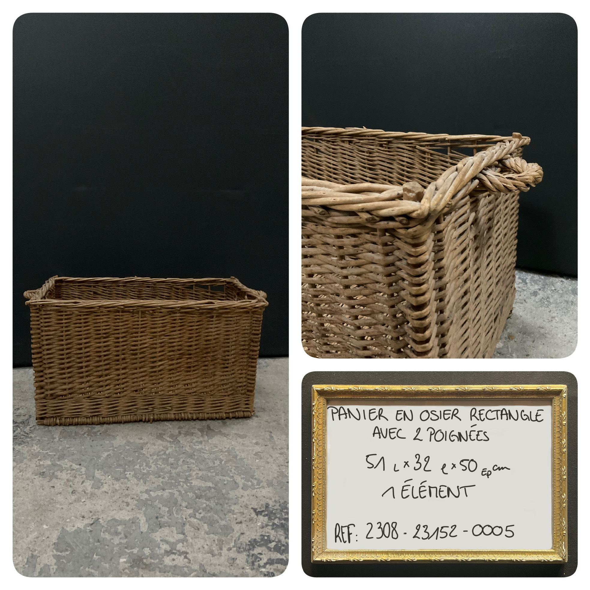 Panier en osier de forme rectangulaire avec deux poignées