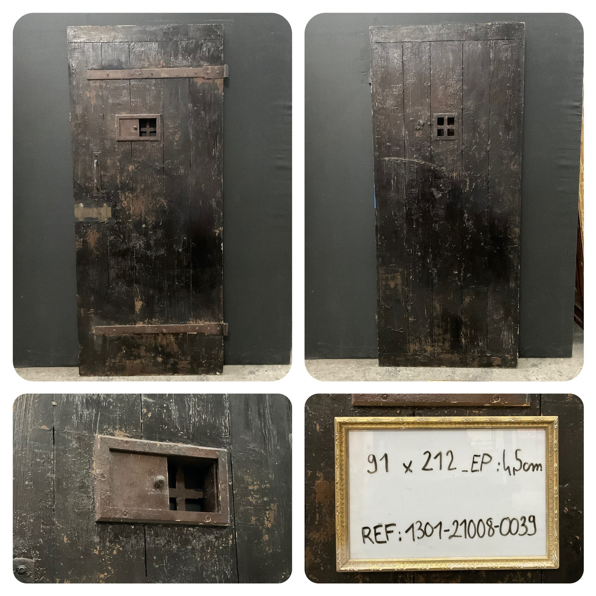 Porte de cachot en bois marron foncé avec hublot praticable et grille, ferrures