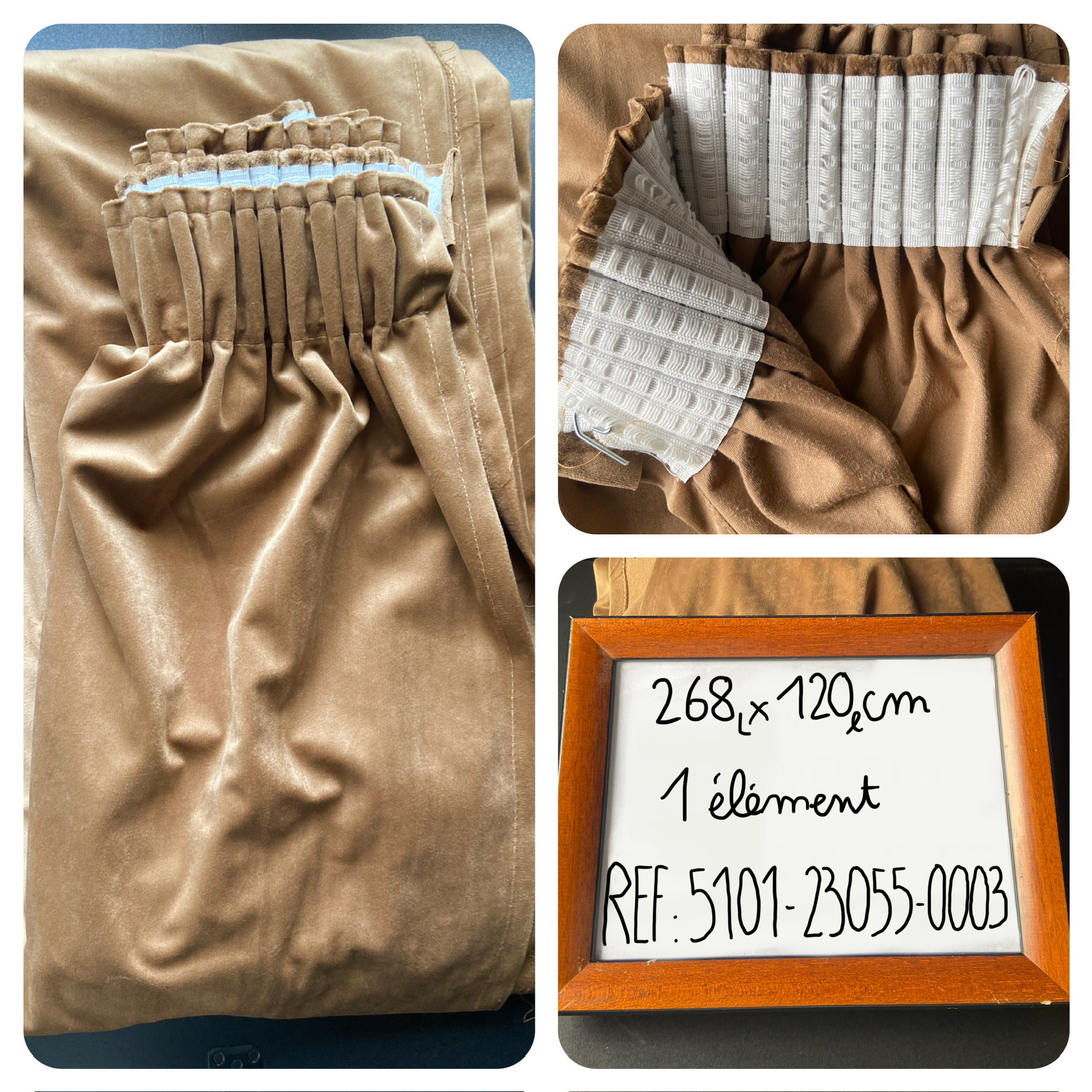 Rideau en velour de couleur café au lait. 3 pièces -> 1 : 215x75 / 2: 210x70 / 3: 215x65