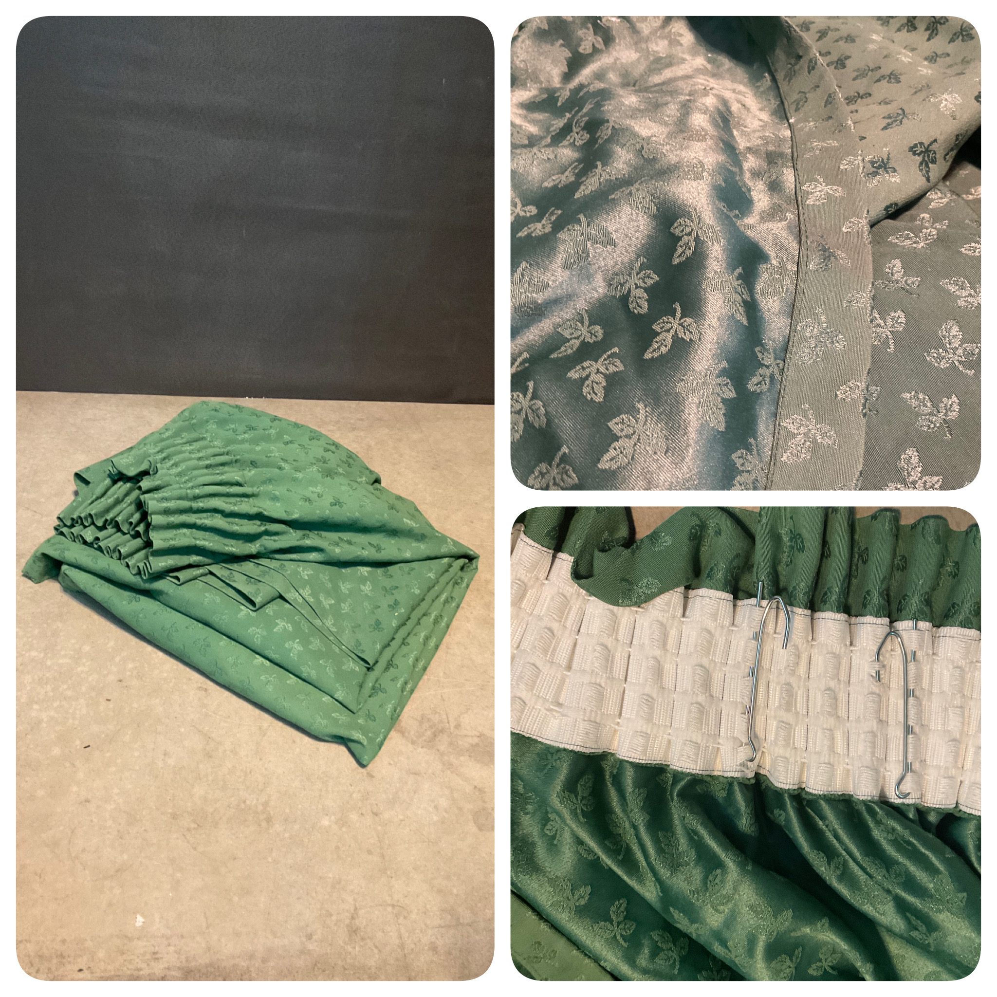 Rideau vert motif feuilles, attache par ruflette