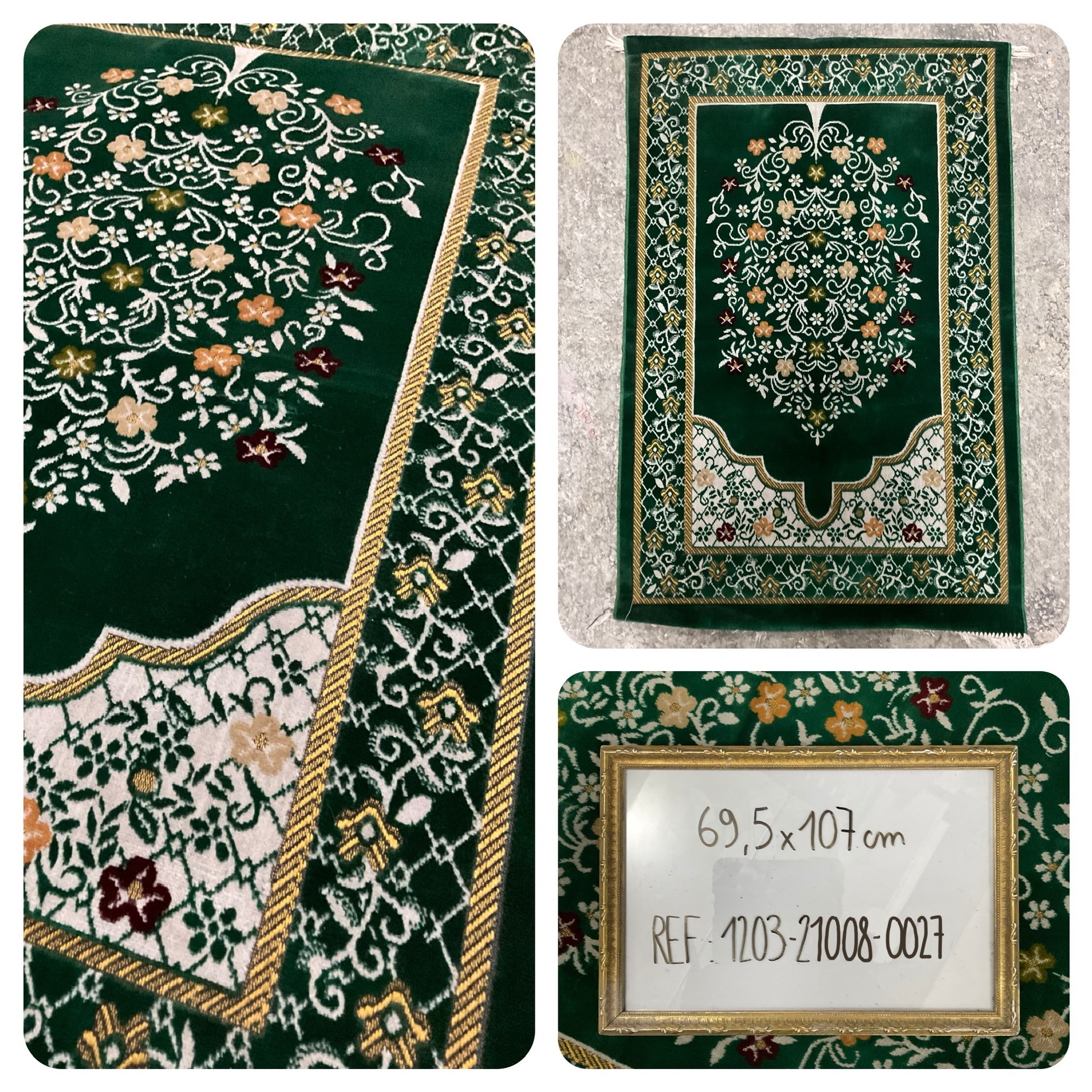 Tapis de prière vert à motifs blancs et dorés, 69,5 x 107 cm