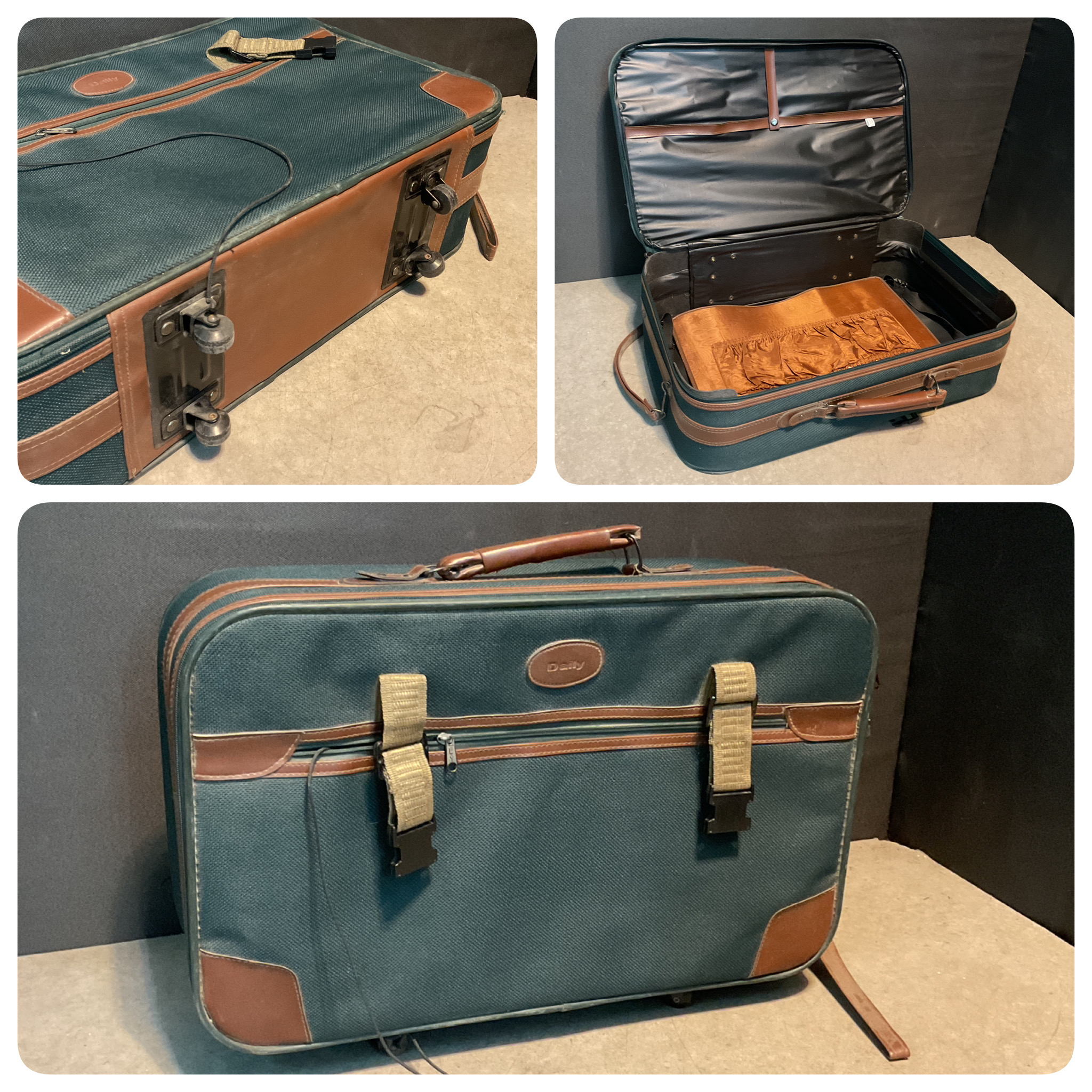 Valise à quatre roulettes, intérieur plastique et tissu satiné.