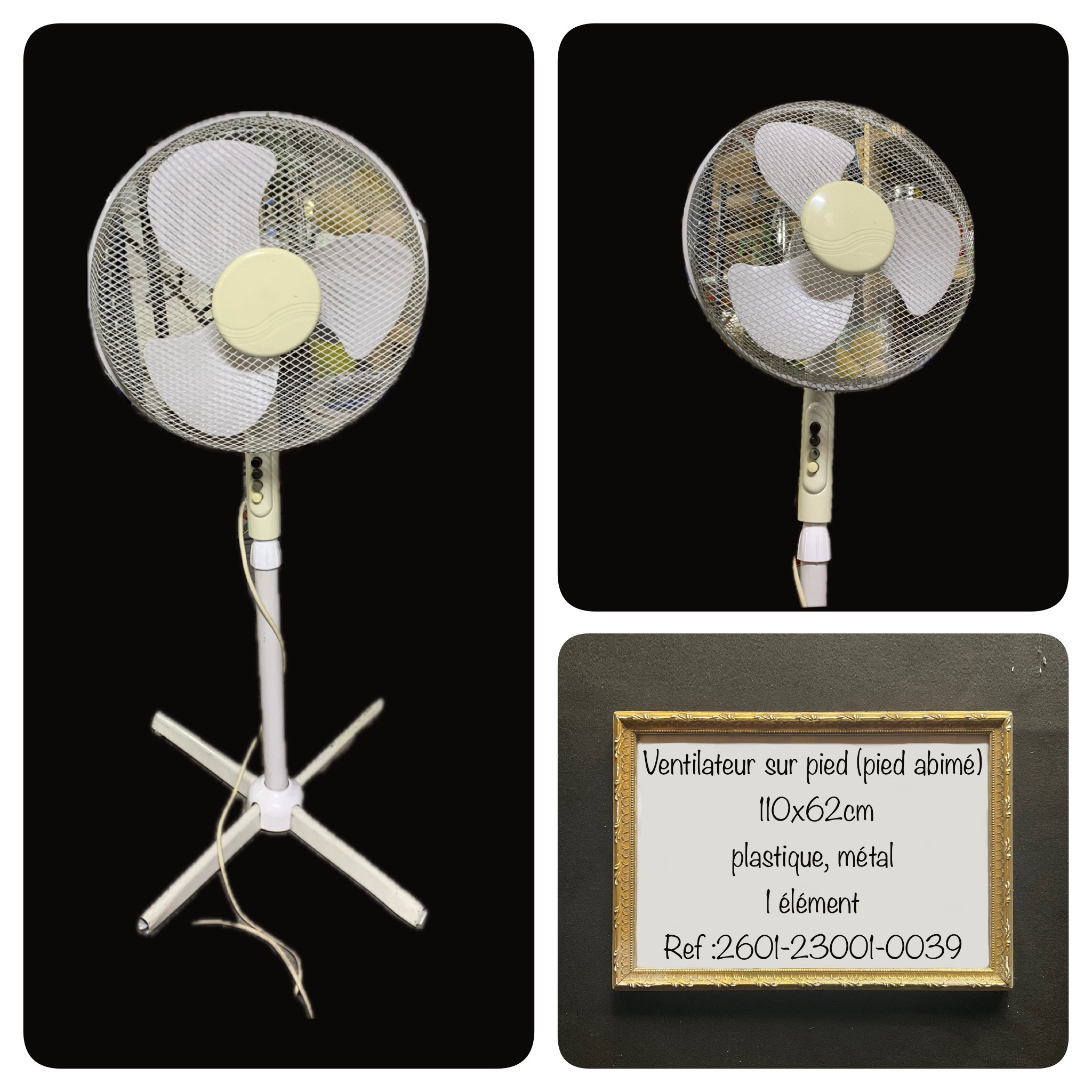 Ventilateur sur pieds (pied abimé) Fonctionnel. Dimension : Diamètre 62cm, Hauteur 110cm. Métal et plastique